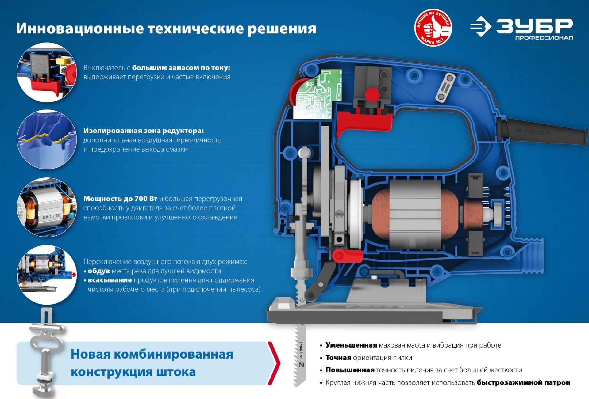 - Мощный двигатель с медной обмоткой имеет высокую перегрузочную способность