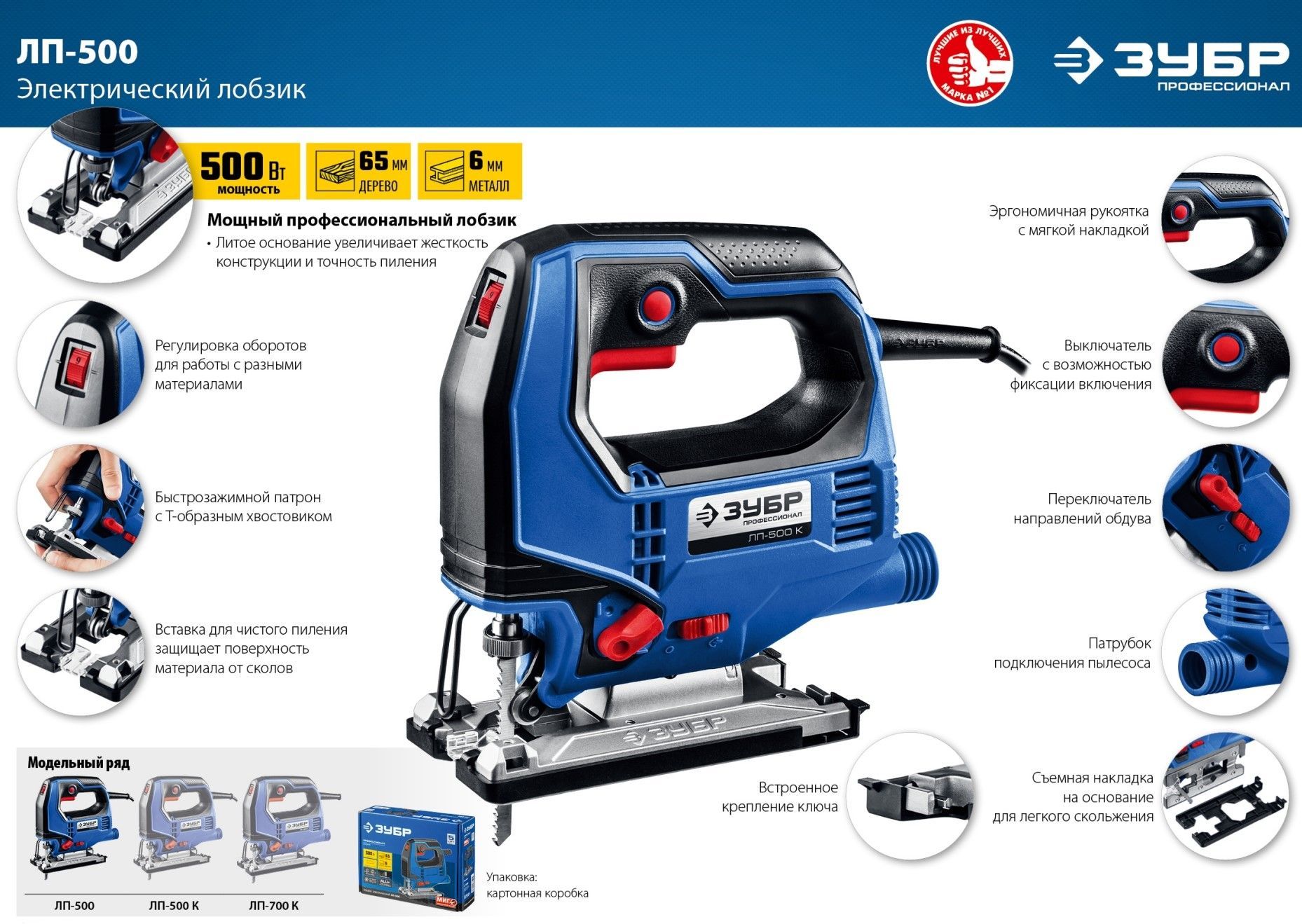 Профессиональный инструмент для всех видов пиления (прямого, наклонного, криволинейного) различных материалов (дерева, фанеры, пластика, металла) от тонких листов до досок толщиной 65 мм. Компактный и мощный, с удобным хватом и отличной маневренностью. Полезные ″мелочи″ вроде вставки для чистого пиления, легко скользящей накладки на основание, встроенного крепления ключа и переключения направлений обдува помогают работать комфортно и эффективно