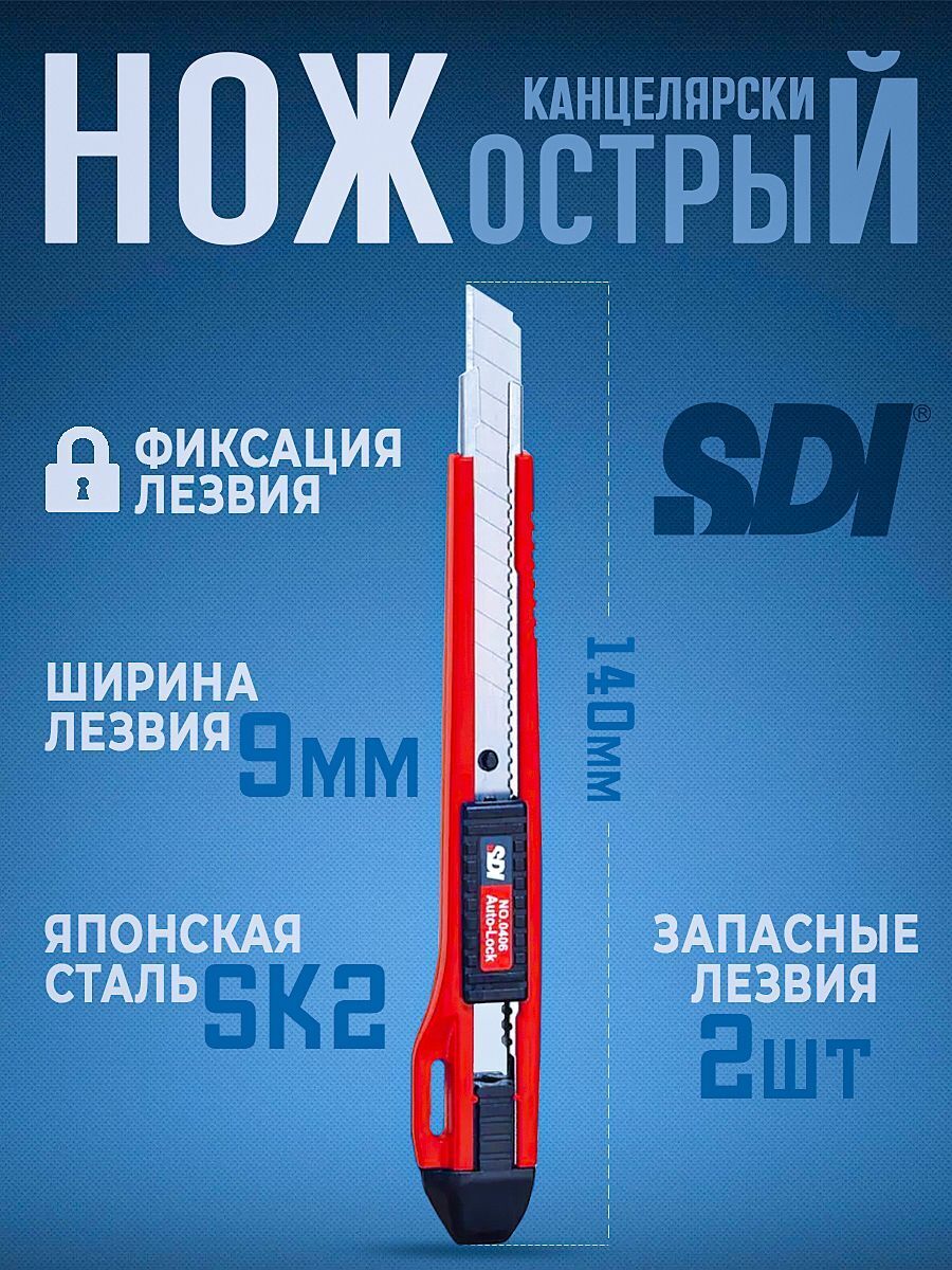 Канцелярский нож SDI с шириной лезвия 9 мм — это идеальный резак для работы с бумагой, картоном, обои, резиной и мелкими строительными задачами. Нож канцелярский строительный разработан с учетом эргономики и безопасности: встроенный механизм автостопа обеспечивает надежную фиксацию лезвия,