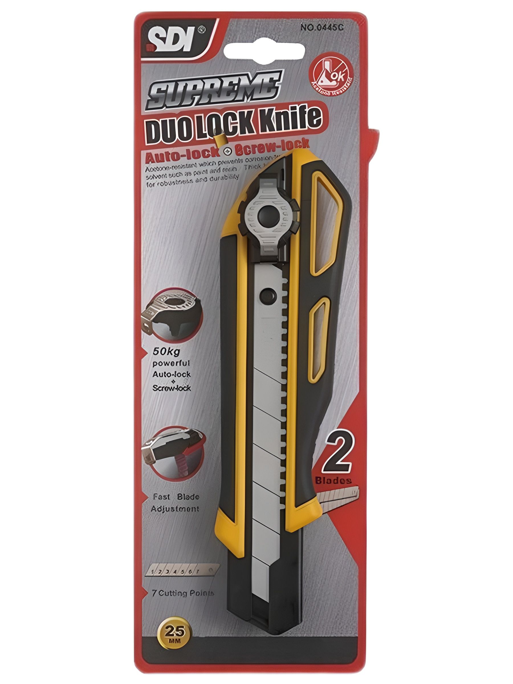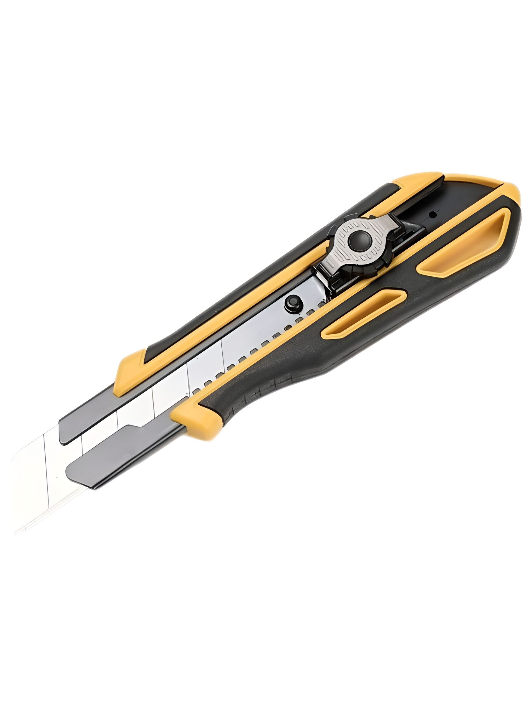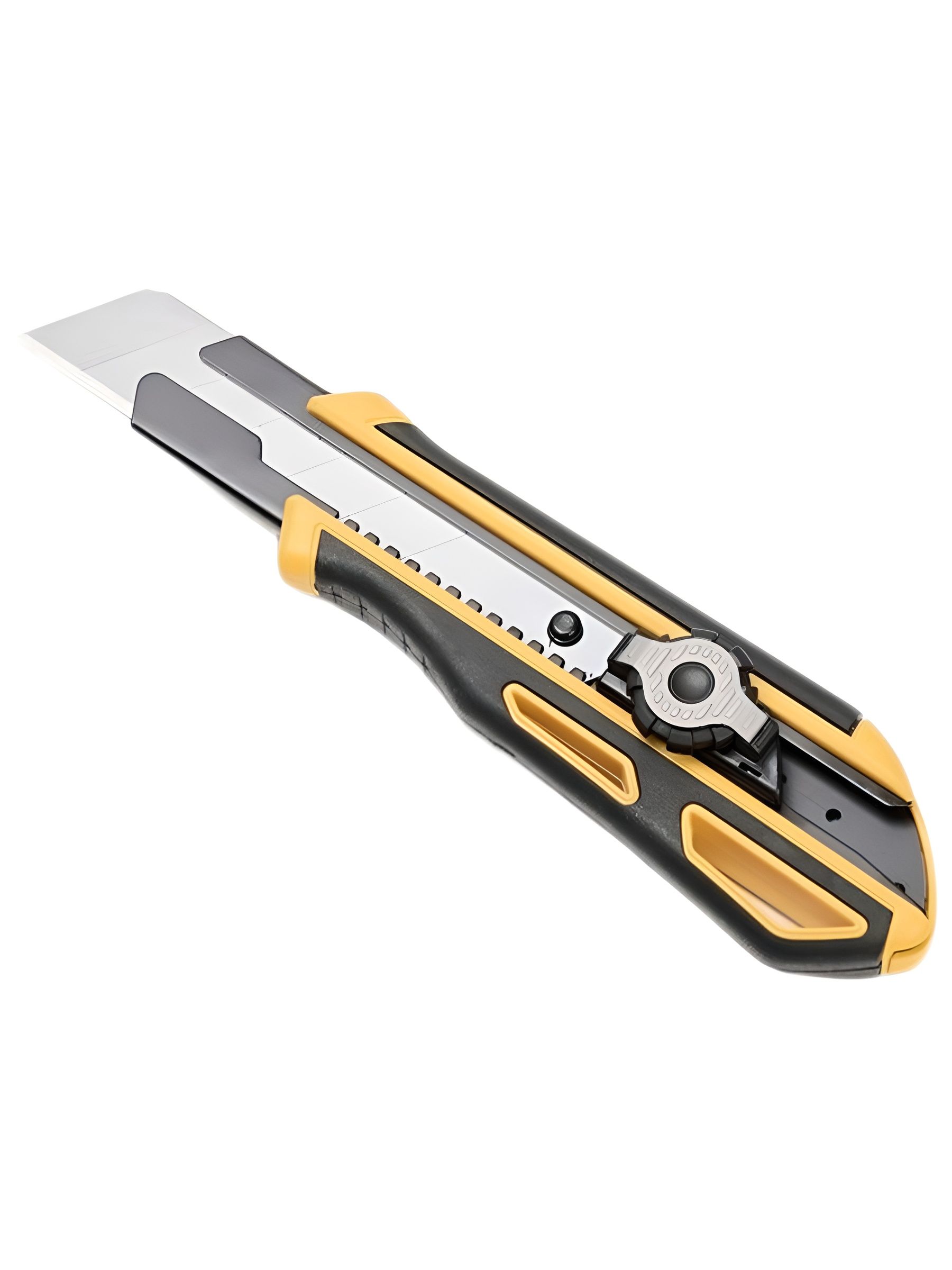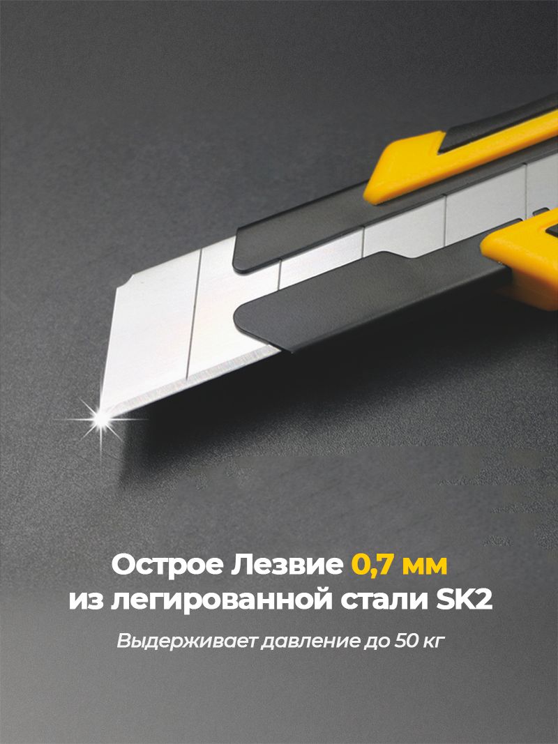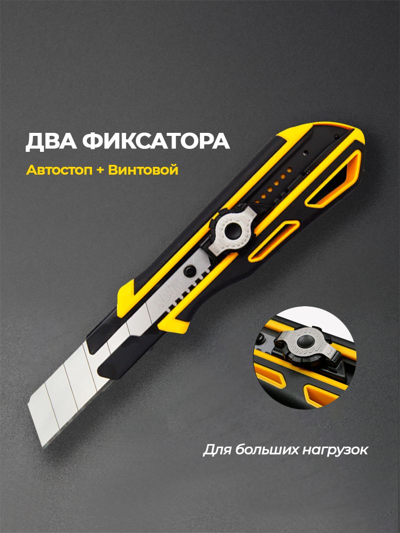 Профессиональный строительный нож с лезвием 25 мм и инновационным фиксатором. Нож оснащен двойным механизмом блокировки(автоматический замок и винтовой замок),который выдерживает давление до 50кг, обеспечивая безопасность и долговечность.