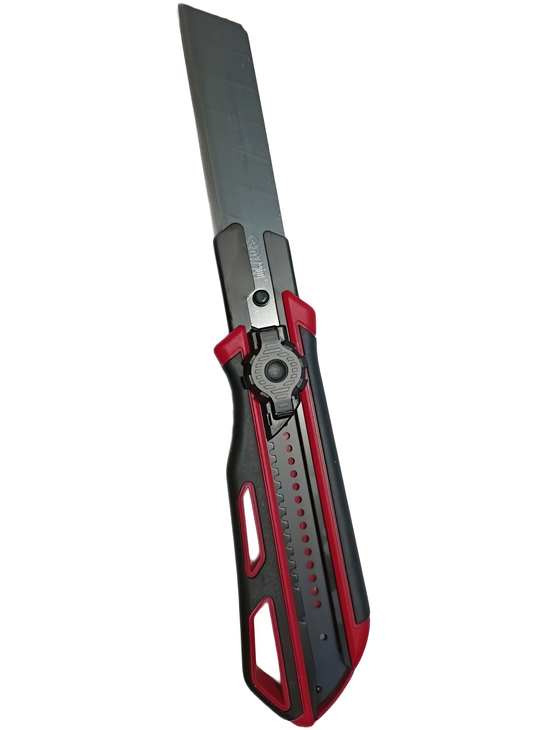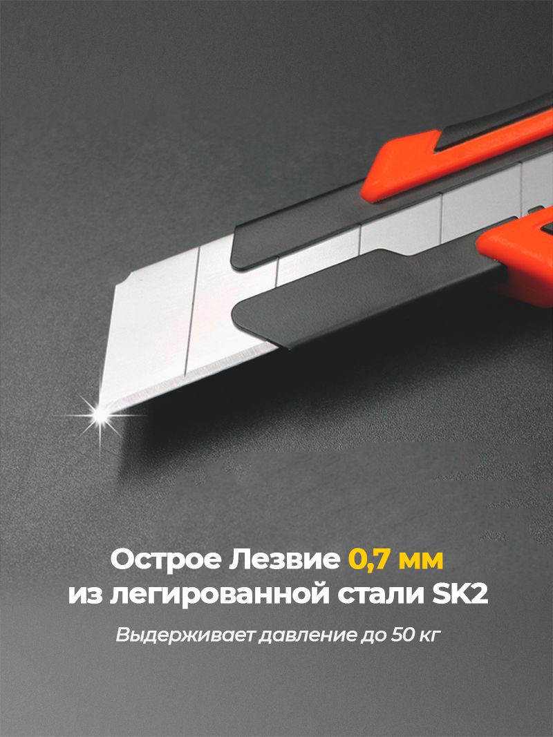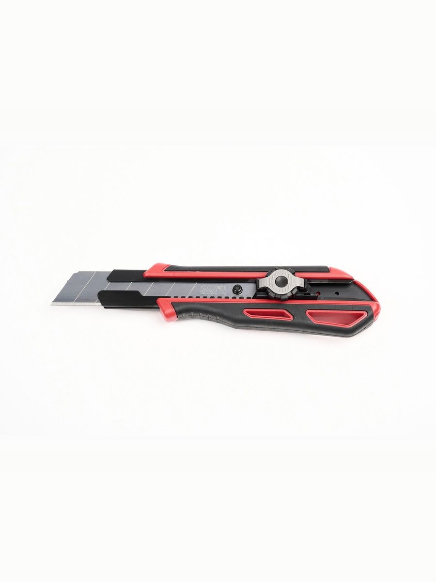 Профессиональный строительный нож с лезвием 25 мм и инновационным фиксатором. Нож оснащен двойным механизмом блокировки(автоматический замок и винтовой замок),который выдерживает давление до 50кг, обеспечивая безопасность и долговечность.