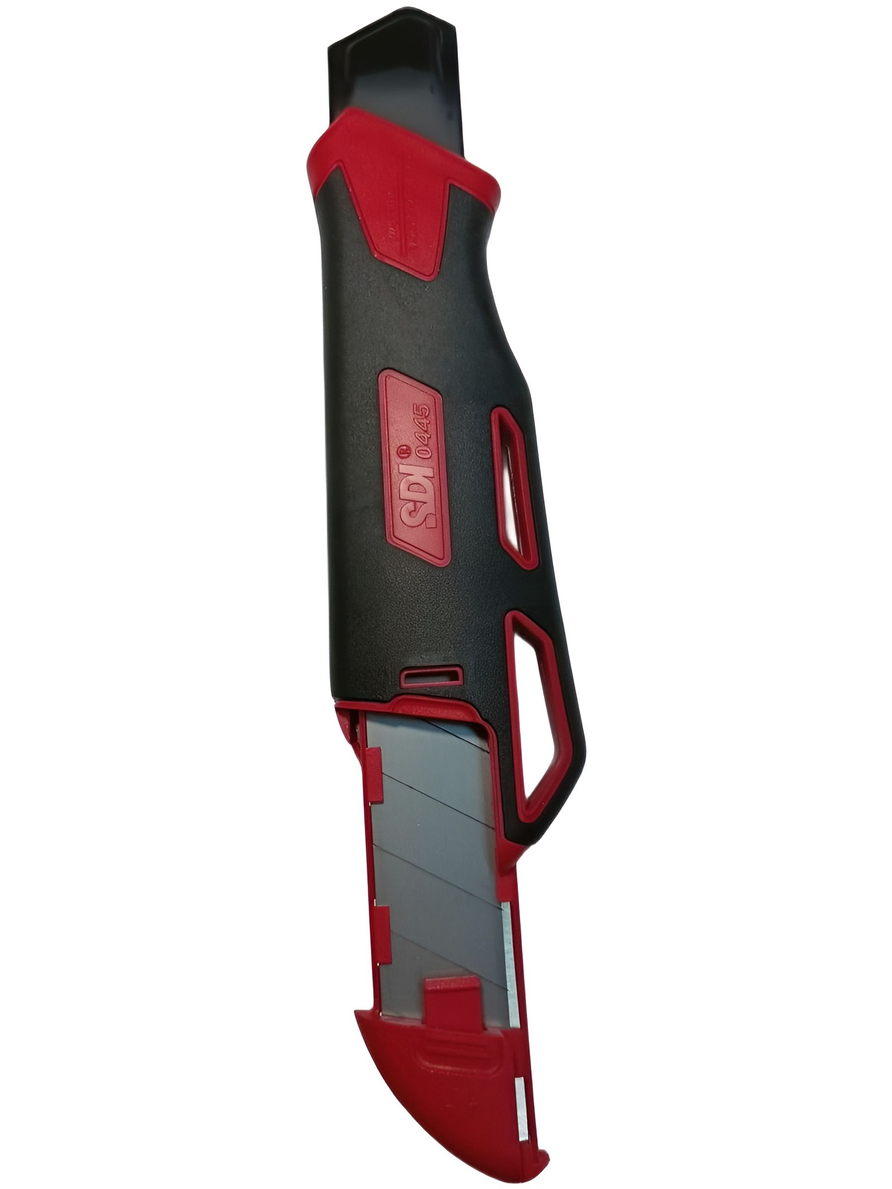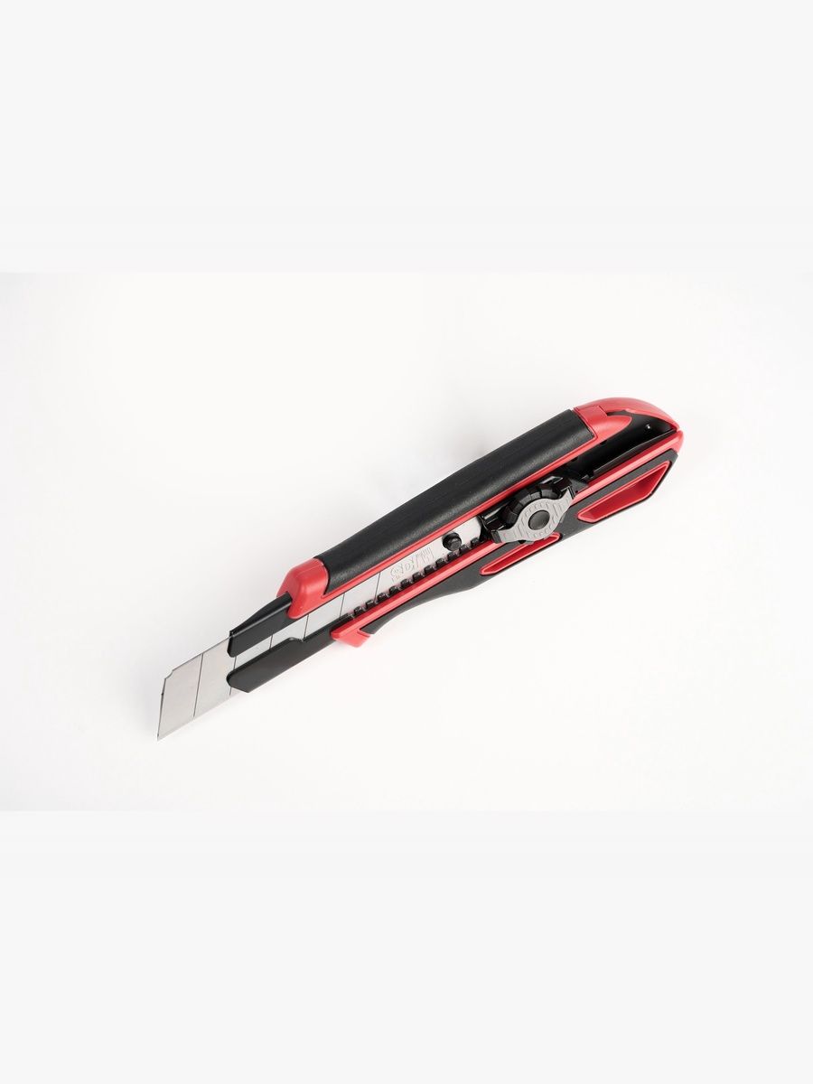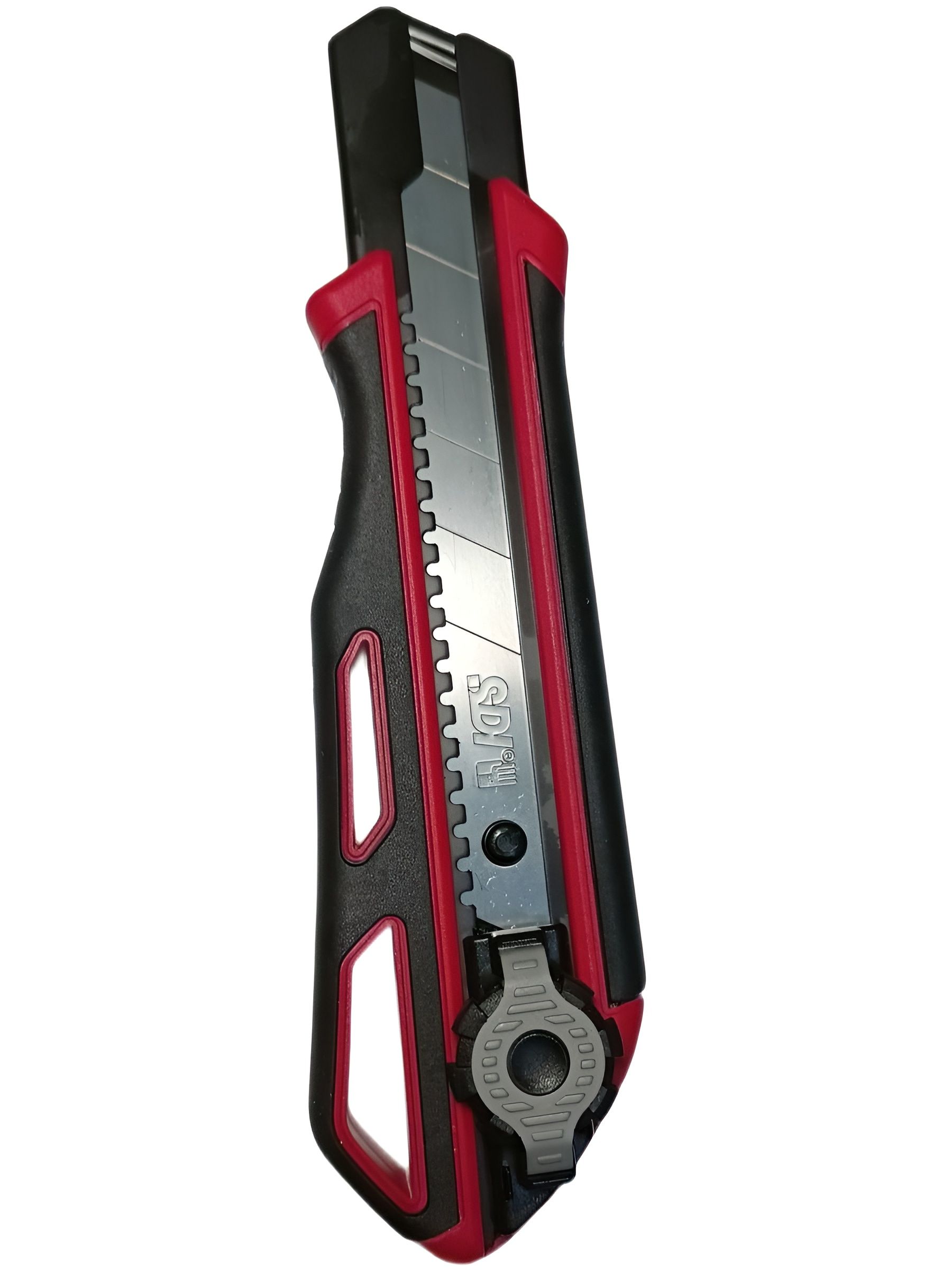 Профессиональный строительный нож с лезвием 25 мм и инновационным фиксатором. Нож оснащен двойным механизмом блокировки(автоматический замок и винтовой замок),который выдерживает давление до 50кг, обеспечивая безопасность и долговечность.
