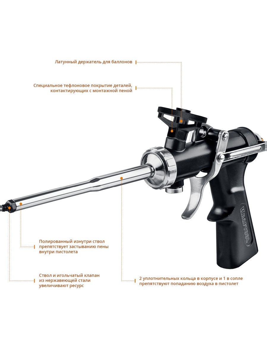 - Ствол и игольчатый клапан из нержавеющей стали увеличивают ресурс инструмента. Полированный изнутри ствол препятствует застыванию пены внутри пистолета