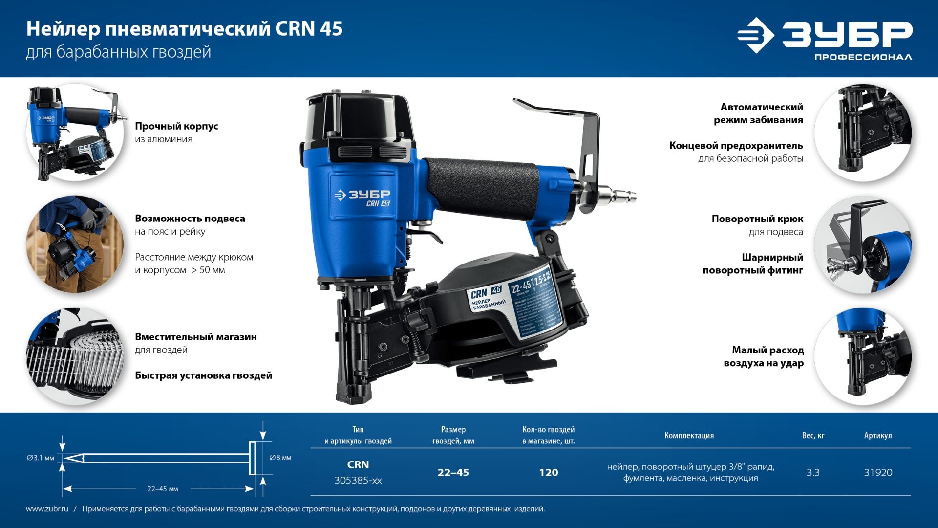 Пневматический нейлер для барабанных гвоздей ЗУБР CRN-45 (арт. 31920) применяется для производства паллет (поддонов) и других изделий, таких как тара, ящики и упаковка.