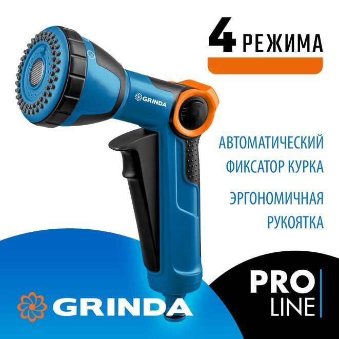 Поливочный пистолет GRINDA X-S с регулятором напора, душевой, 4 режима, курок спереди, двухкомпонентный, PROLine