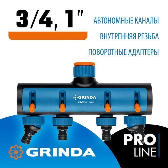 Поливочный распределитель GRINDA PROLine TS-4 четырехканальный, с внутренней резьбой 3/4"-1"
