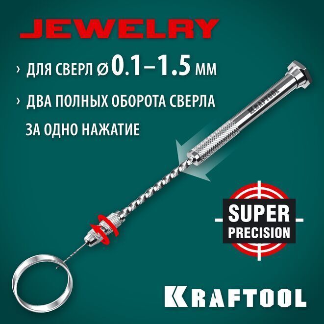 Профессиональная механическая ручная дрель KRAFTOOL Precision для особоточных ювелирных и электронных работ. Механизм вращения из закаленной стали. Корпус из хромированной латуни. Два стальных четырёхлепестковых зажима в комплекте. Для свёрл Ø 0,1-1,5 мм. Два полных оборота сверла за одно нажатие. Большой ресурс. Простота в использовании. Незаменимый помощник для работ требующих повышенной аккуратности.