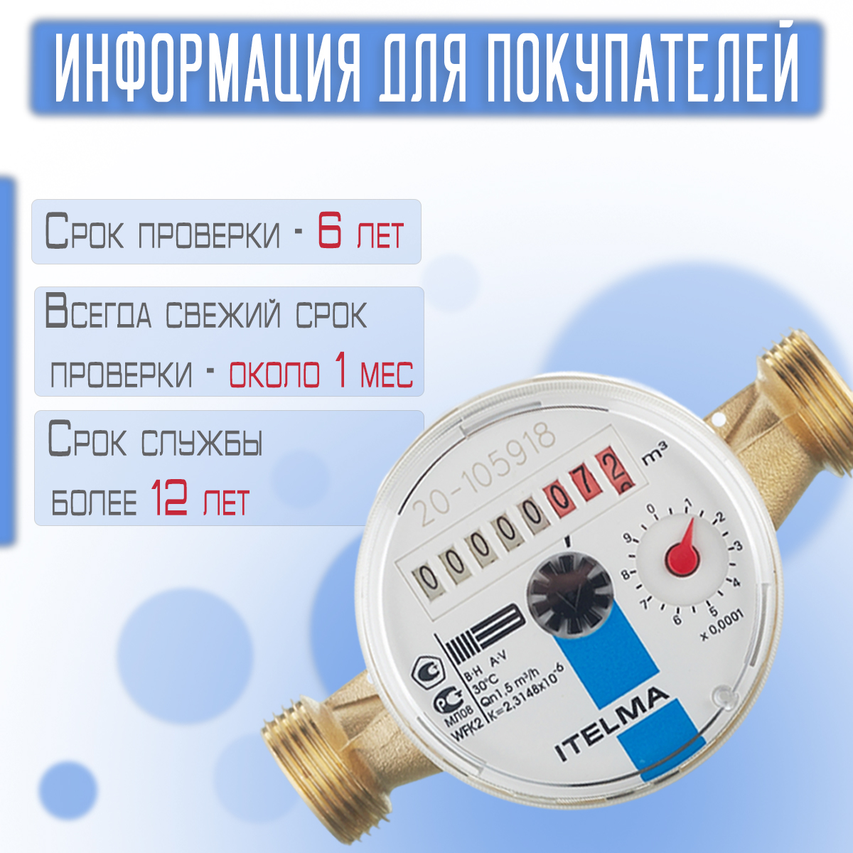 Счетчики ITELMA с самой свежей поверкой. Водосчетчики ИТЭЛМА квартирные одноструйные применяются для учета водопотребления в системах водоснабжения любого типа:в индивидуальных домах, в квартирах, офисах, административных зданиях. Типичными пользователями являются: строительные организации, эксплуатирующие организации (ДЕЗ, РЭУ, ЖСК, ТСЖ) и индивидуальные потребители.Преимущества Счетчики на воду ITELMA производятся по немецкой лицензии из западно-европейских комплектующих Повышенная надежность.
