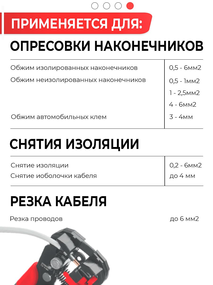 - Обжим изолированных наконечников 0,5-6 мм², неизолированных наконечников 0.5-1 / 1-2.5, 4-6 мм.