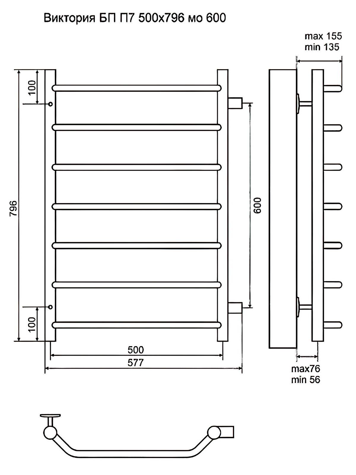 Водяной полотенцесушитель в форме лесенки с 7-ю горизонтальными перекладинами. Материал - полированная нержавеющая сталь AISI 304L. Боковое подключение G1" (внешняя резьба) с межосевым расстоянием 600 мм.Стильный и надёжный полотенцесушитель из коллекции Виктория от Terminus отлично подойдет для любой ванной комнаты, поможет сделать ее теплой, сухой и уютной. Благодаря разнообразию модификаций покупатели смогут выбрать полотенцесушитель исходя из собственных требований, параметров помещения, частоты сушки белья и прочих критериев.Комплектация: заглушка 1шт, кран Маевского 1шт., крепление - 4 шт.