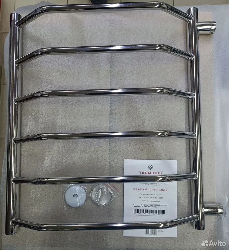 Полотенцесушитель 1 шт., кран маевского 1 шт., заглушка 1 шт., крепление телескопическое 2 шт., тех. паспорт товара.