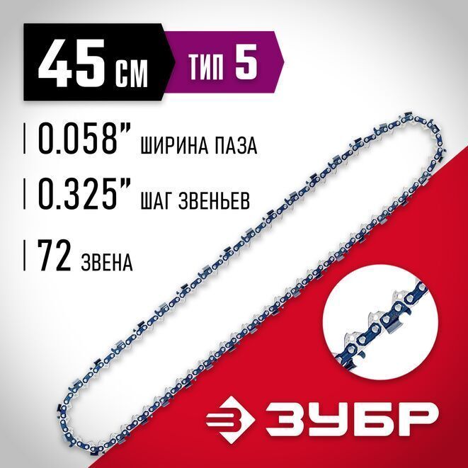 Цепь для бензопилы, ЗУБР тип 5 шаг 0.325" паз 1.5 мм 72 звена, 70305-45