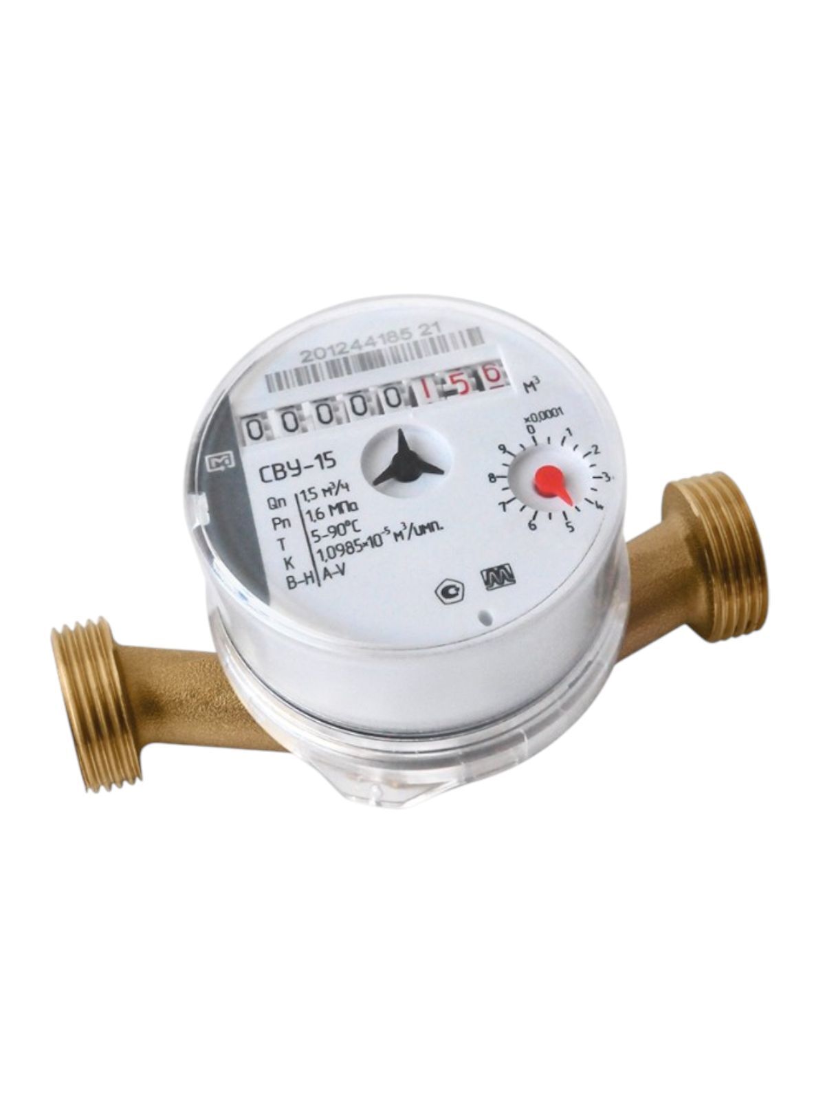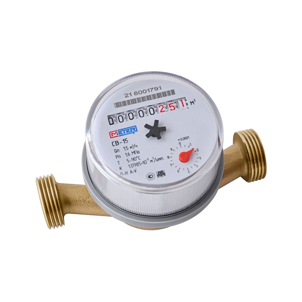 Счетчик воды универсальный МЕТЕР СВУ-15 крыльчатый, одноструйный, сухоходный предназначен для измерения объема воды по СанПиН 2.1.4.1074-01 и СанПиН 2.1.4.2496-09 и сетевой воды, протекающей по трубопроводу при температуре от 5°С до 90°С и рабочем давлении в водопроводной сети не более 1,6МПа (16кгс/см2). Поставляется без комплекта монтажных частей.