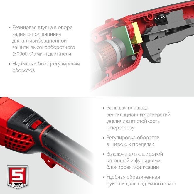 - Регулировка оборотов в диапазоне 3000-11000 об/мин для большей универсальности использования