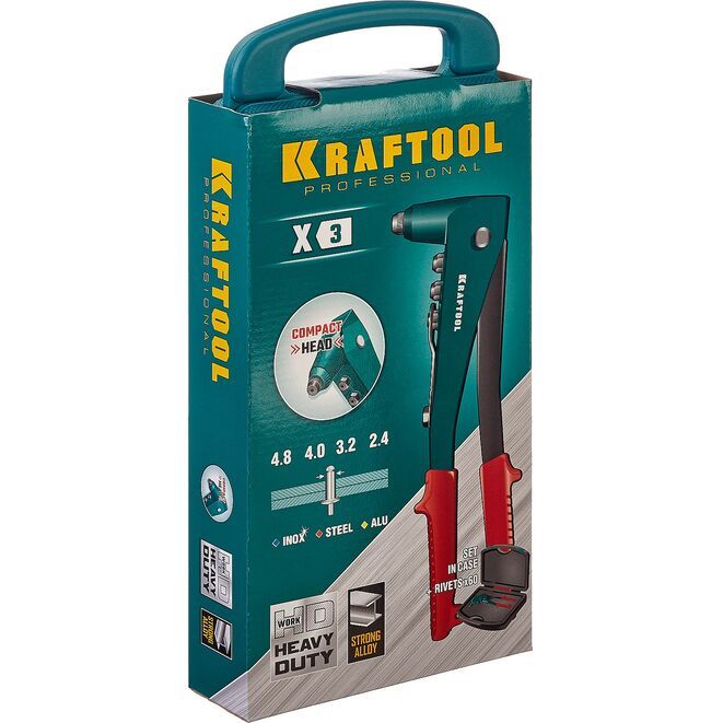 Заклепочник KRAFTOOL выдерживает высокие рабочие нагрузки и предназначен для установки заклепок из алюминия, стали и нержавеющей стали различных диаметров согласно таблице.