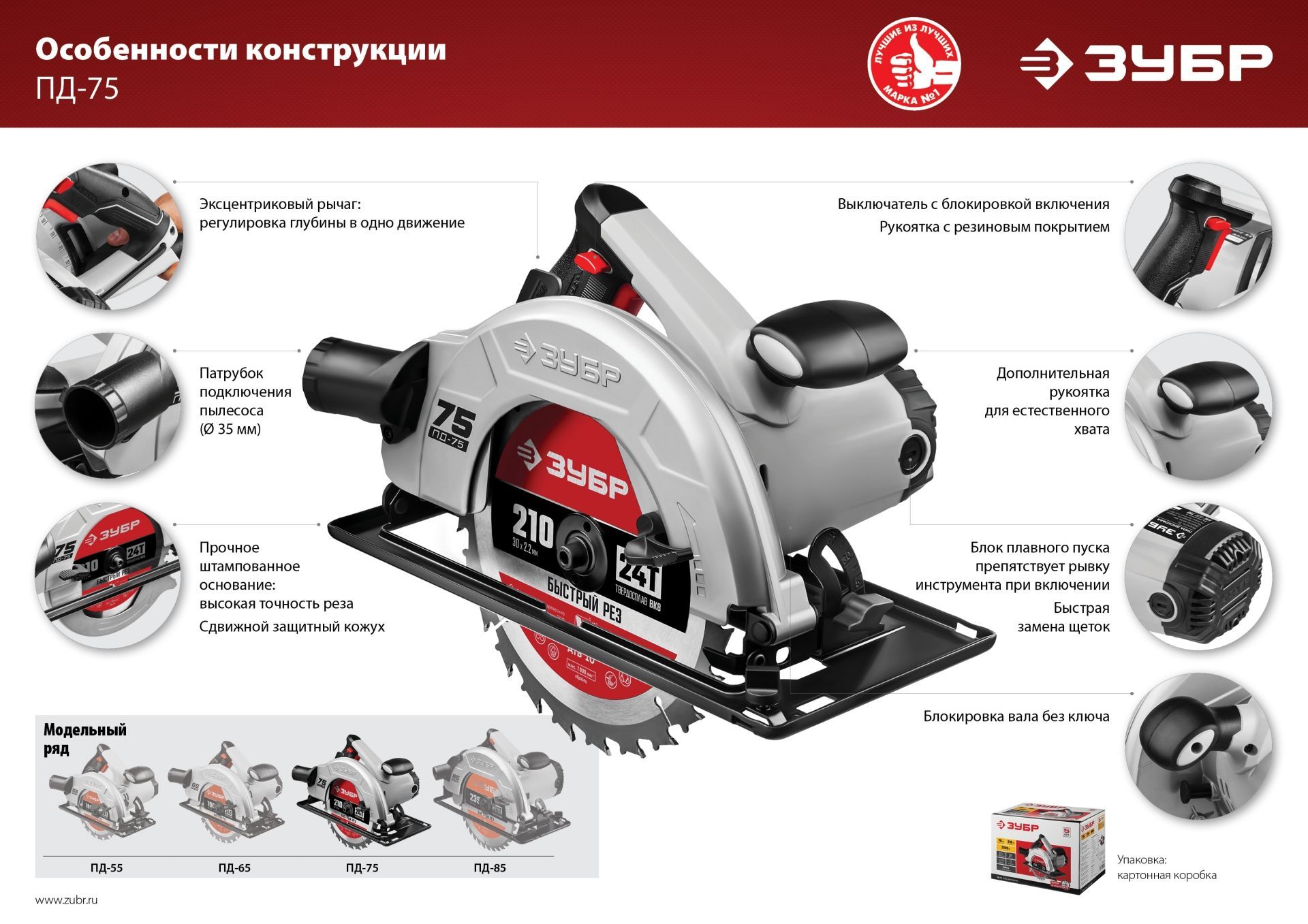 - Бесступенчатая регулировка глубины и угла пиления для точных работ